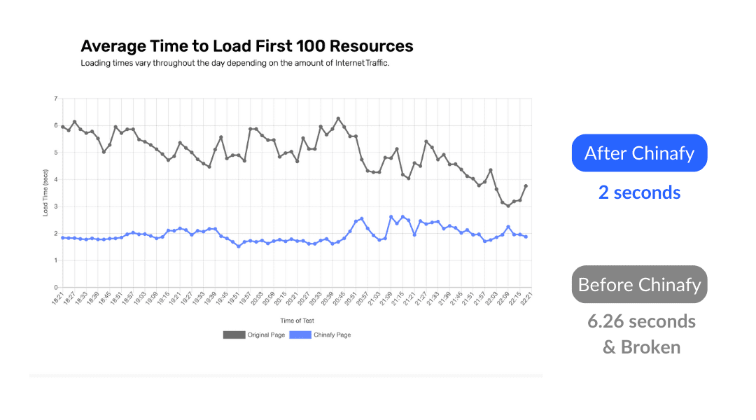 Over 80 data points were collected to run a 4-hour time series analysis that compares the original site and the Chinafy version in Beijing.