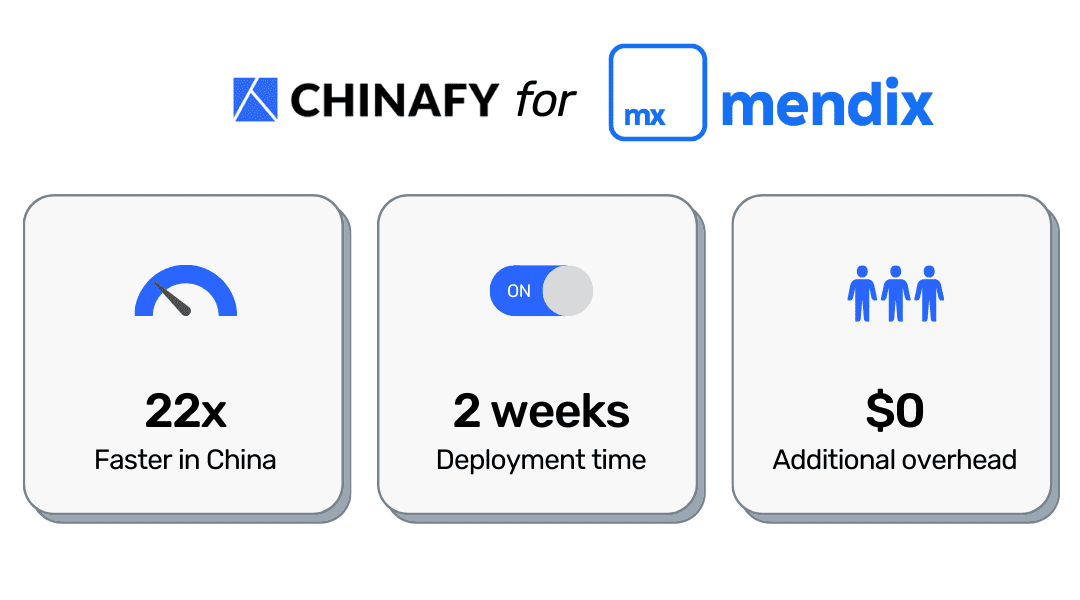 With Chinafy, Mendix achieved 22.5x faster full-load times (from 30+ seconds down to under 2 seconds), improved resource delivery, and better overall user experience in China.