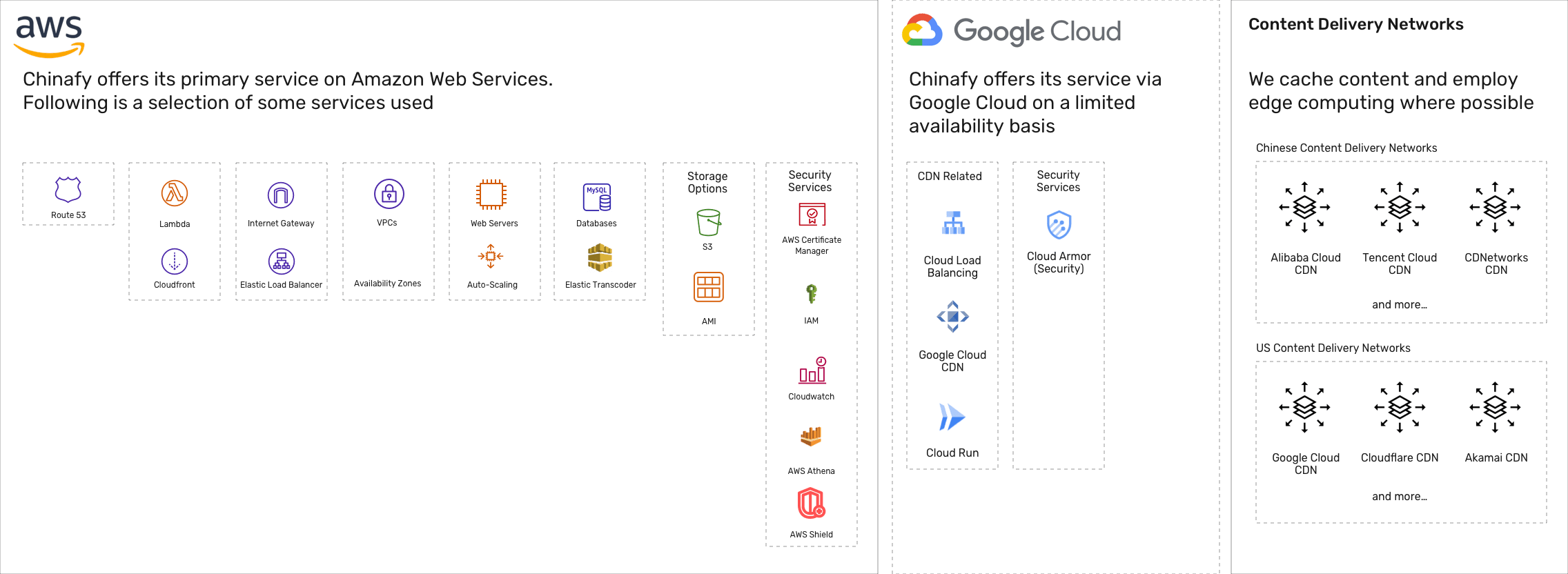 Chinafy’s primary servers reside in the US with AWS in N. Virginia. We are increasingly building redundancy with Google Cloud hosting data in their Singapore location. Separate to this, we use multiple CDN providers and may use one or more of these providers, depending on your requirements.